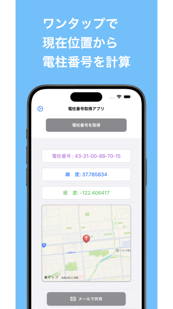 新アプリ「電柱番号計算アプリ」登場!現在地から電柱番号を即算出。操作簡単、GPS利用で正確性抜群。メールやLINEで位置情報を簡単共有。