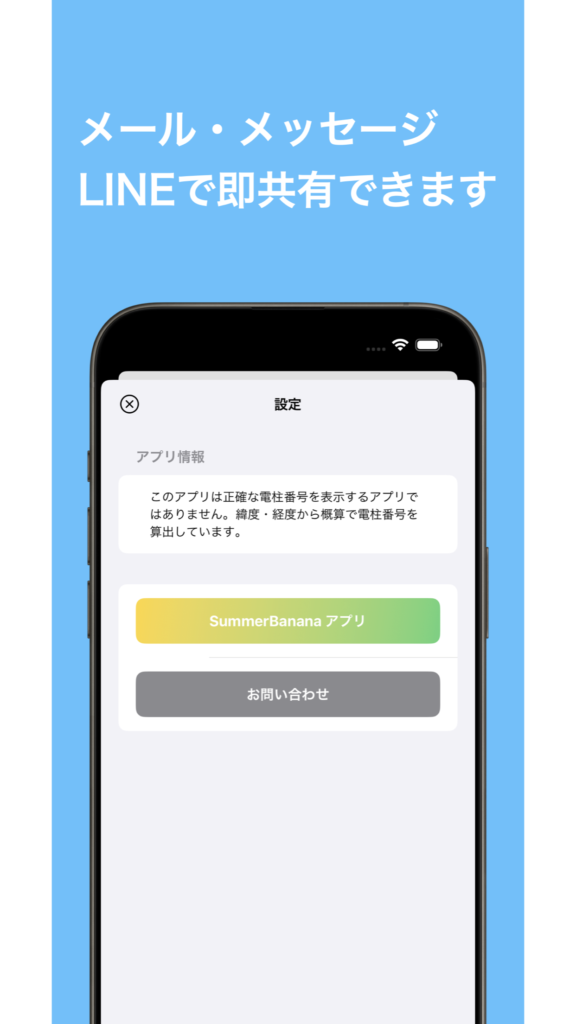 算出された座標(電柱番号に関連する情報)を、メール、メッセージ、LINEなどで手軽に共有できます。