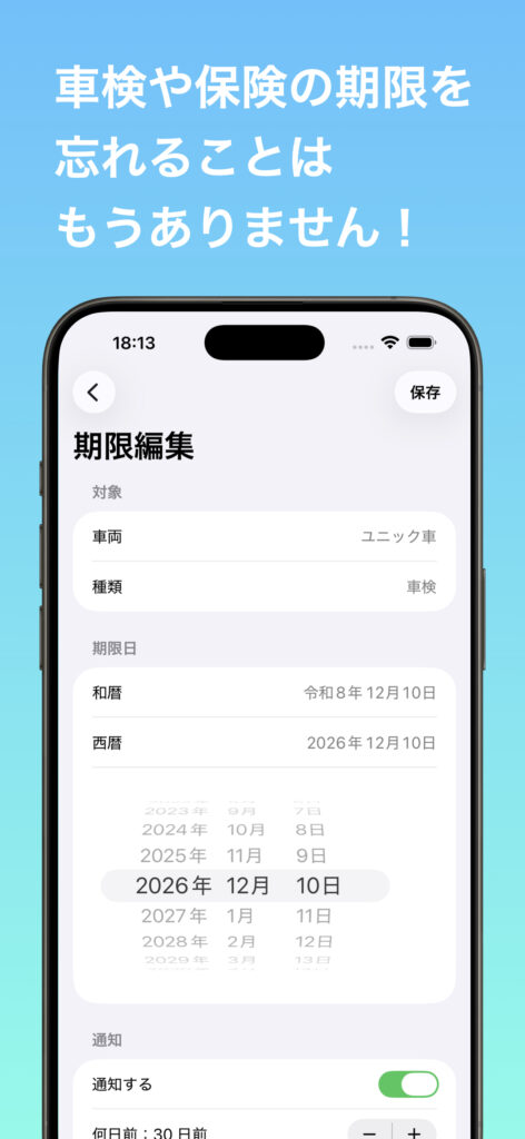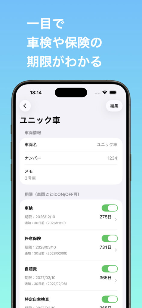 車検・保険・点検をシンプルに管理できる車両期限管理アプリ。