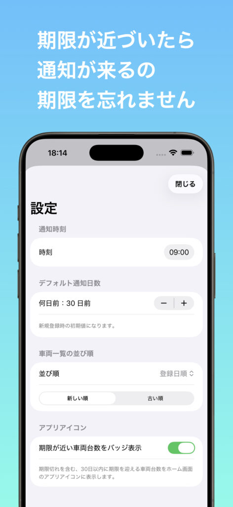 アプリを開かなくても、ホーム画面のアイコンバッジで期限間近な車両台数を即座に確認できます。